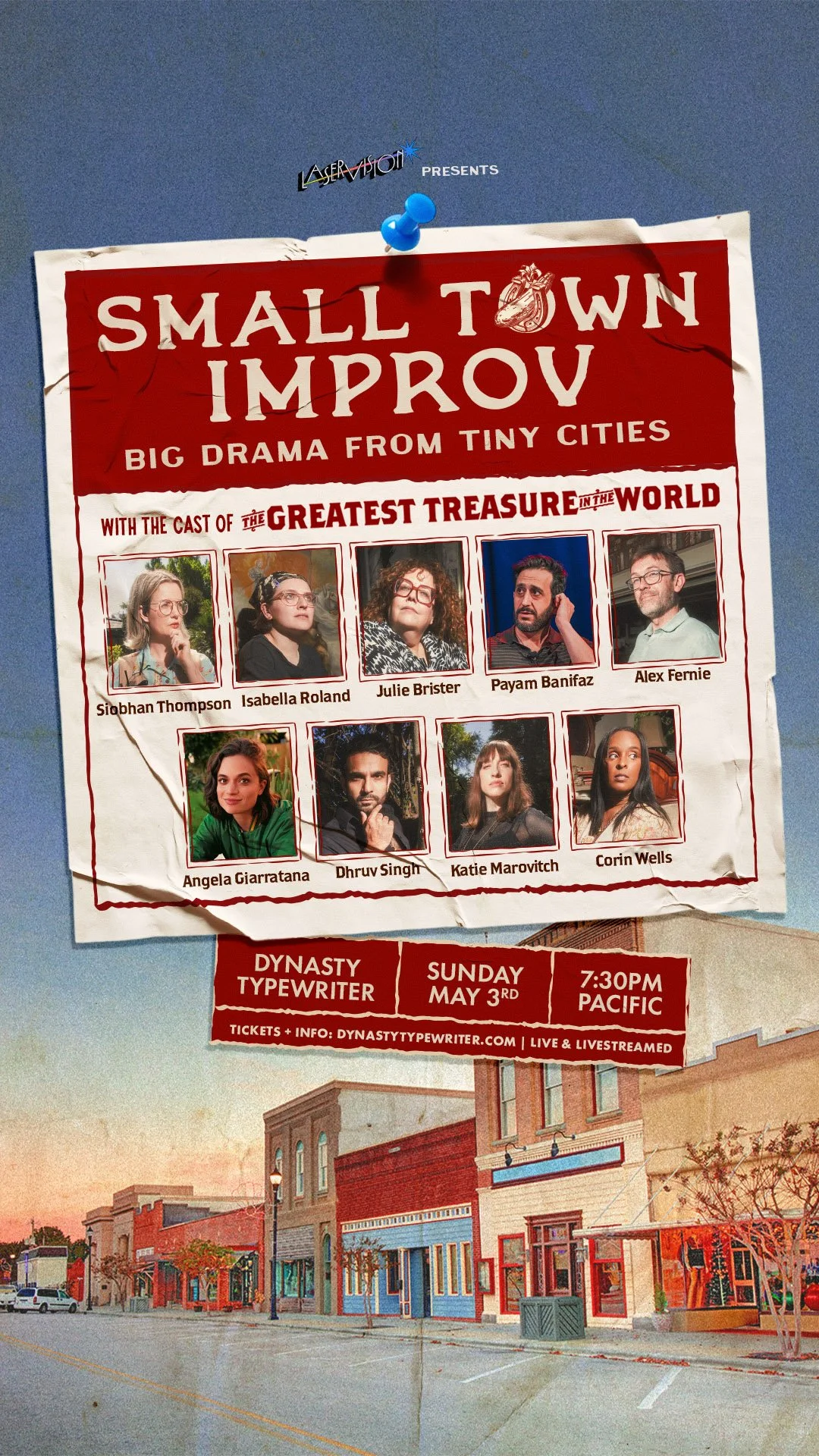 May 3: Improv about a small town! With the cast of “The Greatest Treasure in the World,” a comedy by Isabella Roland and Siobhan Thompson. 5/3 7:30pm @ Dynasty Typewriter.